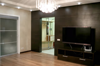 Потолок также состоит из 2х уровней: натяжной и гипсокартон. Во всей квартире 3х уровневый свет.