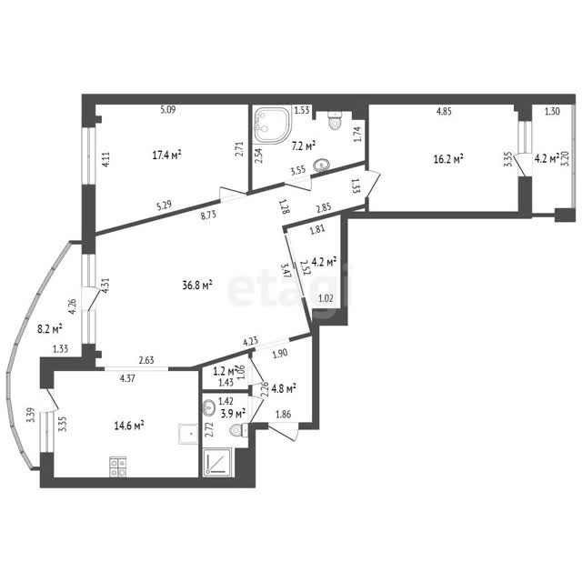 Площадь квартиры 118.7 м2, общая площадь 106,3 м2, жилая площадь 70.4 м2.